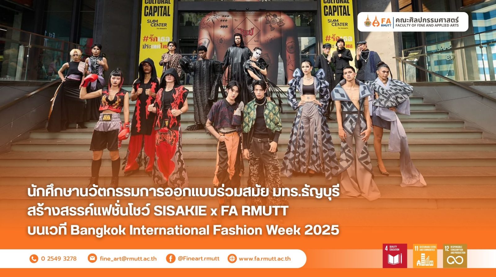 นักศึกษาชั้นปีที่ 3 สาขาวิชานวัตกรรมการออกแบบร่วมสมัย (กลุ่มแฟชั่น) คณะศิลปกรรมศาสตร์ มหาวิทยาลัยเทคโนโลยีราชมงคลธัญบุรี จัดแสดงผลงานแฟชั่นโชว์ SISAKIE x FA RMUTT ในงาน Bangkok International Fashion Week 2025 ณ Visionary Stage ชั้น G สยามเซ็นเตอร์ 👗✨