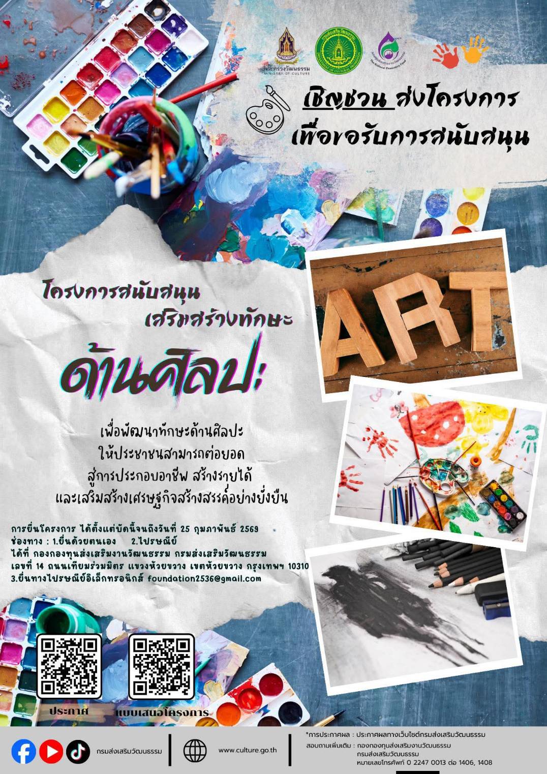 กรมส่งเสริมวัฒนธรรม กระทรวงวัฒนธรรม ร่วมกับกองทุนส่งเสริมงานวัฒนธรรม ขอประชาสัมพันธ์เชิญชวนผู้สนใจ ยื่นโครงการเพื่อขอรับการสนับสนุน ภายใต้ โครงการสนับสนุนเสริมสร้างทักษะด้านศิลปะ เพื่อพัฒนาทักษะด้านศิลปะให้ประชาชนสามารถต่อยอดสู่การประกอบอาชีพ สร้างรายได้ และเสริมสร้างเศรษฐกิจสร้างสรรค์อย่างยั่งยืน