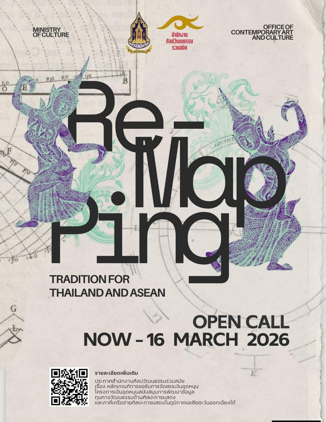 สำนักงานศิลปวัฒนธรรมร่วมสมัย กระทรวงวัฒนธรรม ขอประชาสัมพันธ์เชิญชวนผู้สนใจ ยื่นเสนอโครงการเพื่อขอรับการจัดสรรเงินอุดหนุน ภายใต้ โครงการเงินอุดหนุนสนับสนุนการพัฒนาข้อมูลทุนทางวัฒนธรรมด้านศิลปะการแสดงและภาคีเครือข่ายศิลปะการแสดงในภูมิภาคเอเชียตะวันออกเฉียงใต้ (Re–mapping Tradition for Thailand and ASEAN) ประจำปีงบประมาณ พ.ศ. 2569